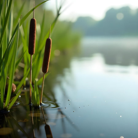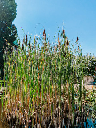 Tall green cattails stand majestically above still water, surrounded by lush vegetation and clear blue sky, showing the beauty of nature and peaceful environment