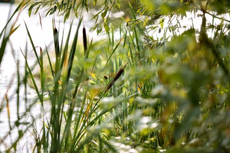 Tall reeds have grown near the lake. A beautiful sunny day. Natural background.