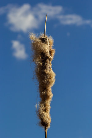 Seedy reed stalks and head in winter on background of blue sky Nature waiting for spring cat-tail