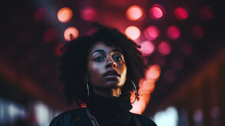 A woman with an afro in front of a red light, AI