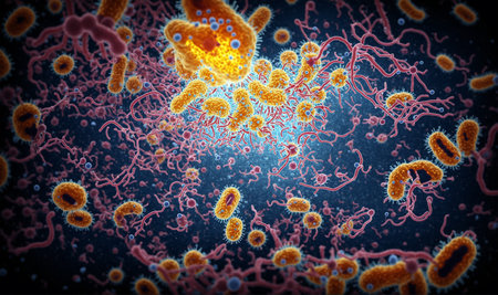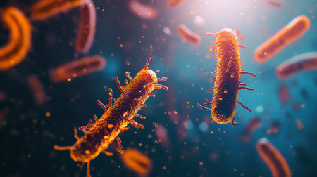 a detailed microscopic view of numerous bacteria cells with orange and red highlights in a blue environment