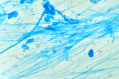 red Mycobacterium tuberculosis on blue background.
