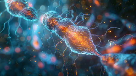 Close-up view of bacteria in a vibrant microscopic world, showcasing intricate details and colorful structures.
