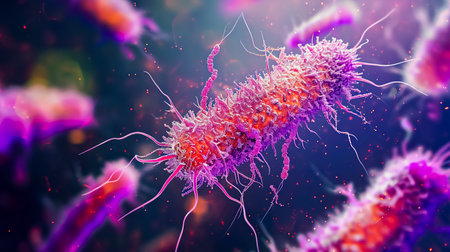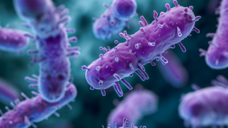 This detailed image features vibrant bacteria with hair-like structures, showcasing their dynamic motion in a microbial environment, highlighting scientific exploration.