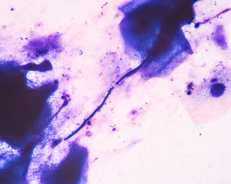 Budding yeast cells with pseudohyphae from sputum gram stain test, in laboratory,fine with microscope.