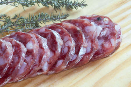 extreme closeup, detailed. salami sausage cut into thin pieces on a wooden board