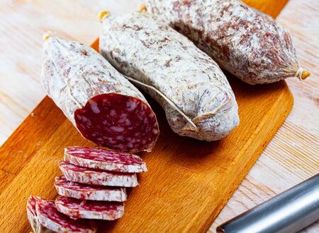 Closeup of a delicious dry sausage on a wooden cutting board