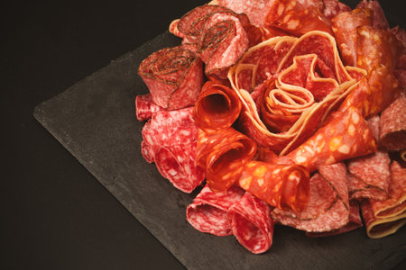 Sliced deli meats with perfect marbling, from salami to prosciutto, Generative AI
