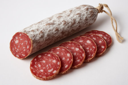 Sliced cured sausage on light background highlighting delicious meat presentation in minimalist style. concept of traditional cuisine, gourmet food, simple elegance.