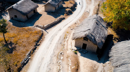 Top view of a quiet African village with thatched roofs, offering open space for text