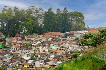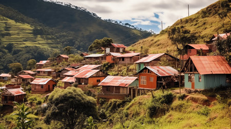 A beautiful hillside village with many charming houses nestled among lush green trees and mountains. The scene is picturesque and peaceful, evoking a sense of calm and serenity.