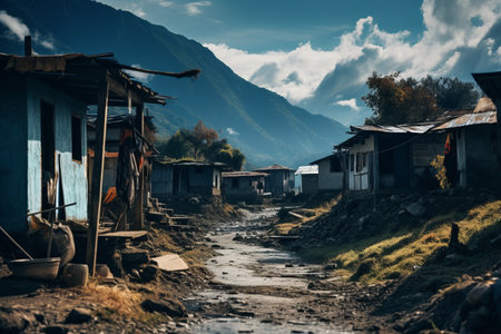A narrow dirt path meanders between traditional stone and mud houses in a remote mountain village, highlighting simple architecture and rural life.