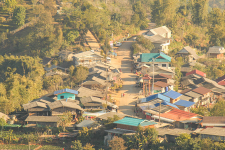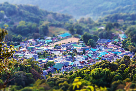 Small hill tribe village in valley with tiltf-shift effect