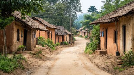 A peaceful village street in Garvajodh, India, with traditional mud houses and greenery, capturing the serene atmosphere of rural life in this Indian village.