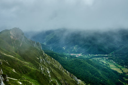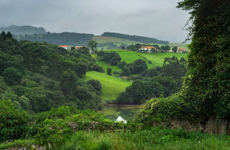 Scenic view of valley in Asturias with traditional farm buildings and green meadows a foggy day