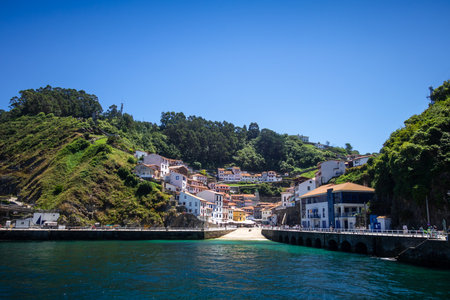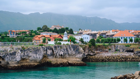 Picturesque coastal town in Northern Spain, featuring traditional houses with red roofs perched atop dramatic cliffs overlooking a turquoise bay. Llane,s, Asturias