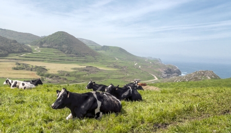 Cantabrian fields situated in the mountains of Cantabria in the north spain, cattle grazing and the sea at the background