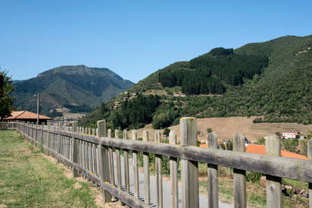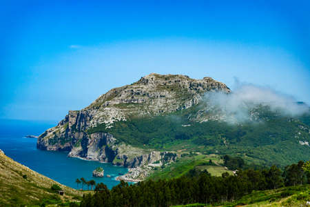 Landscape with a small village, hill, forest, sea and blue sky with clouds. Basque Country, Spain. Camino de Santiago