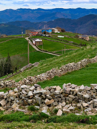 Ariestebano, famous village of Vaqueiros culture, surrounded by meadows and stone walls, Valdes muncipality, Asturias, Spain
