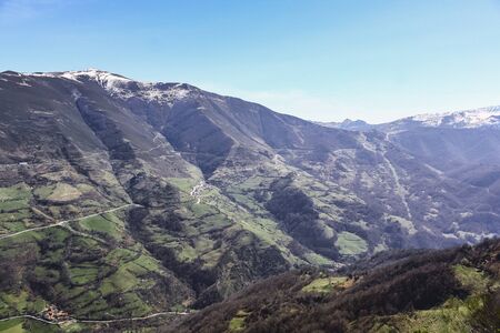 Landscape of a green valley in spring with some snow on the peaks during a sunny day in northern Spain. Relating to tourism, travel and hiking