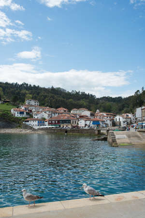 Vertical shot of Tazones from its harbor. Two seagulls at the front part. Asturias. Spain