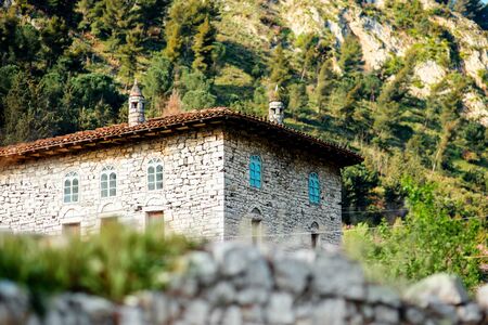 Ancient house with blue windows in Berat city, Albania