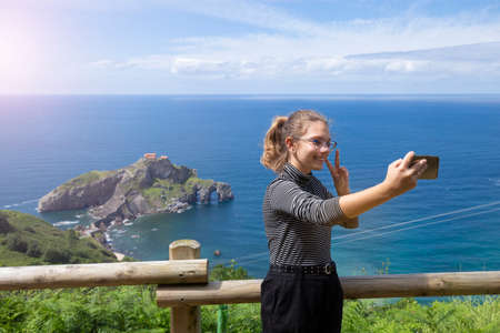 Close-up shot of lovely young girl taking selfie and showing peace gesture at Bay of Biscay, Spain