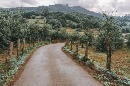 Winding rural road in Asturias, Spain, bordered by wooden fence posts and lush green trees, leading through misty hills and serene farmland under a cloudy sky after rain, evoking calm and escape