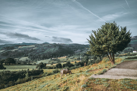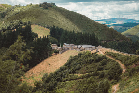 Picturesque rural valley landscape with winding dirt road, scattered farmhouses, fields, trees and hills, creating a peaceful countryside view in northern Spain mountains
