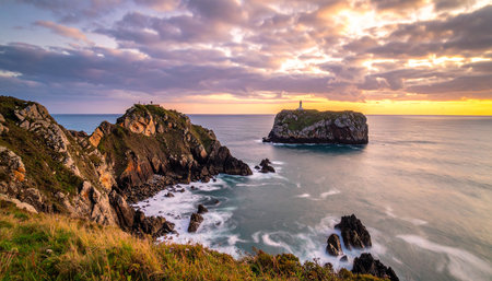 A dramatic sunset illuminates the sky over a rugged coastline with a lighthouse on a small offshore island.