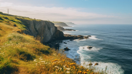 A calm and peaceful coastal cliff with a rocky edge and a gentle breeze