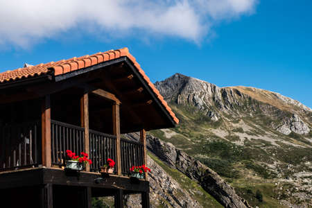 A house or refuge in the middle of the mountains of asturias and lake of covadonga during winter with a green grass and snow