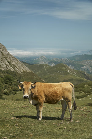 Landscape of the Asturian mountain pass of San Isidro.In the photograph you can see in the foreground a typical brown cow of the place.The photo is taken on a sunny day and shot in horizontal format.