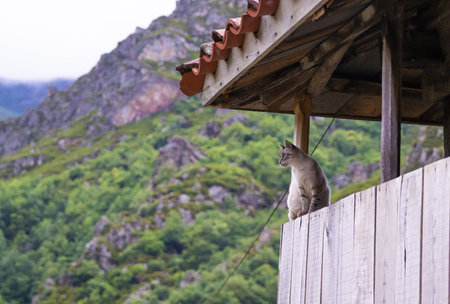 A cat sitting in a pavilion on mountain background
