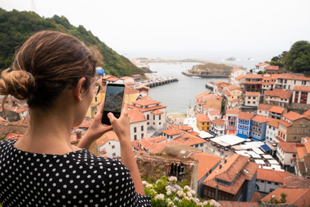 Young woman taking a picture of Cudillero village in Asturias with her mobile phone