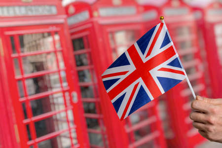 Union Jack flag of Great Britain on red background, Queen's Platinum Jubilee and holiday celebration concept