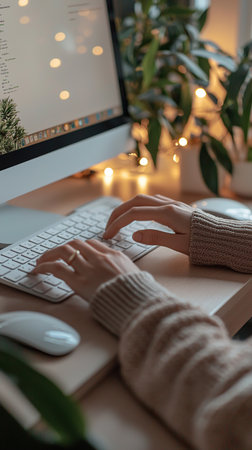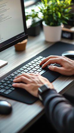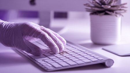 Gloved hand is actively typing on a sleek keyboard in a contemporary office setup, featuring a small plant and ambient lighting.