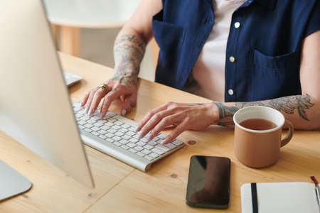 Close-up of young woman with tattoos on her hands typing on keyboard at table and drinking tea, she doing her online work on computer