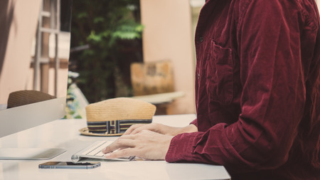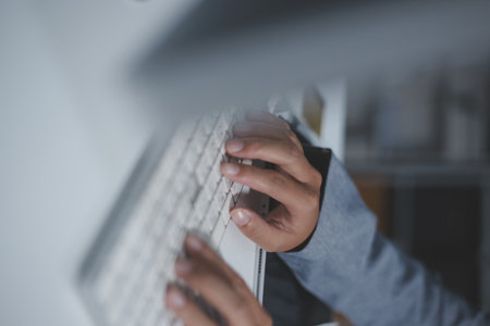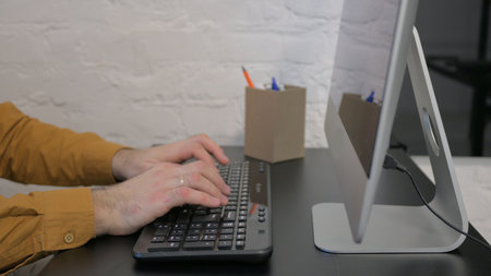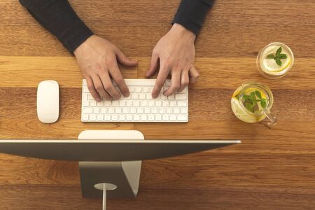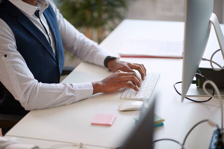Person typing on a computer keyboard, businessman is working in a startup company's office, he is typing messages to his colleagues and making financial documents summarizing the meetings. Copy space.