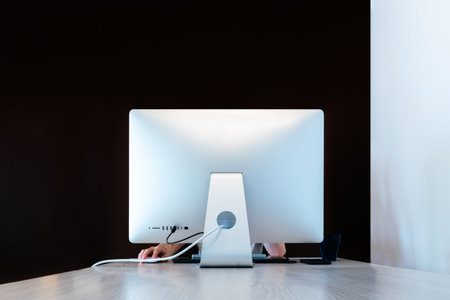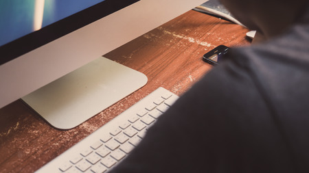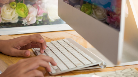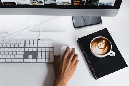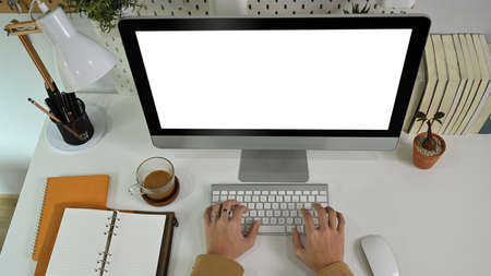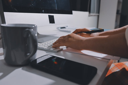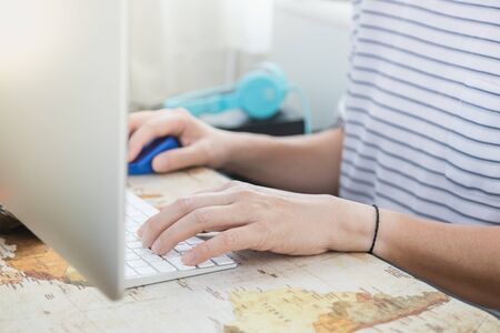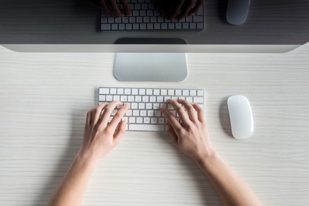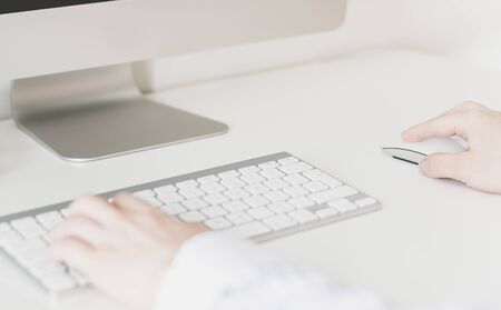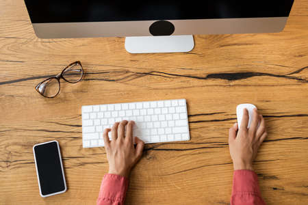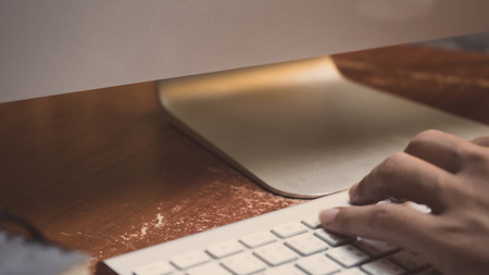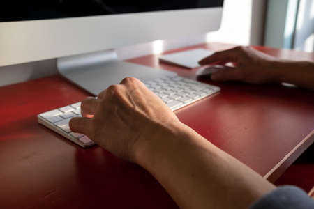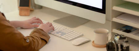 Cropped image of photographer hands typing on wireless keyboard and using mouse while sitting in front computer monitor that putting on working desk.