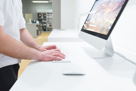 Hands of a man close-up on a mouse and a computer keyboard in a technology store. The buyer uses a computer at an electronics store. Purchase monoblock. Choosing a computer in the store.