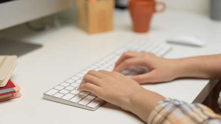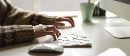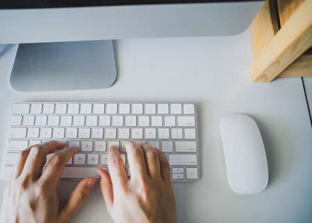 Close up view of of female freelancer hands typing on computer keyboard on white table with supplies in minimal office room