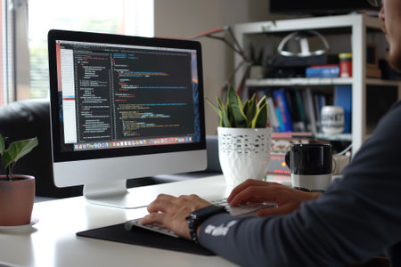 person coding and typing on a keyboard and a monitor on a desk with a coffee mug and a plant
