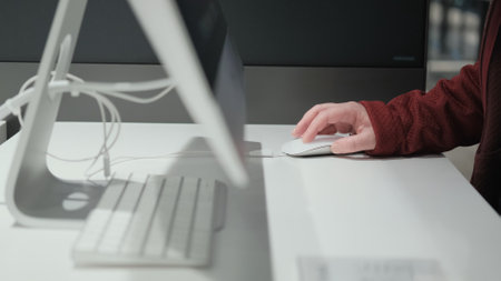 Close up of teenager boy hand using white computer mouse at technology exhibition. Entertainment and educational concept
