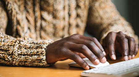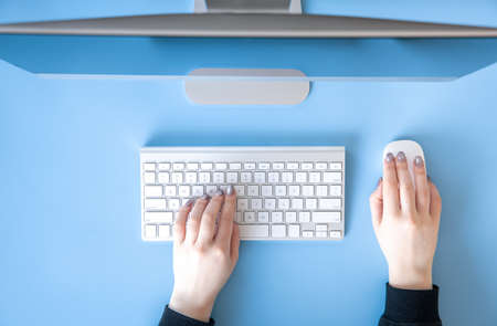Woman works with a computer, one hand is on the keyboard, the other on the mouse. Remote work. Contemporary workplace and lifestyle.