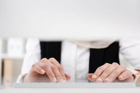 Closeup of a businesswoman browsing on a computer keyboard against a white background. Hands of a productive entrepreneur typing emails and compiling online reports while doing research and planning