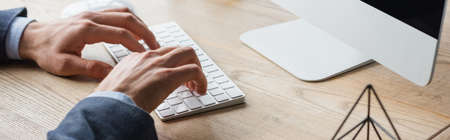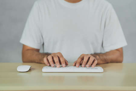 Office manager male hands typing on computer keyboard, closeup. Businessman working, typing on the wireless keyboard, no face, concept of office work