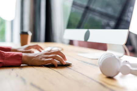 cropped view of african american woman using computer mouse near blurred paper cup and headphones on desk