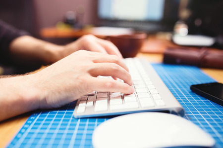 Professional designer man working at the computer. Closeup of male hands and white desktop.