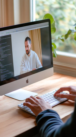 Individual participating in an online therapy session, focusing on stress relief and anger management. Engaging with a therapist through a computer, emphasizing modern time management solutions